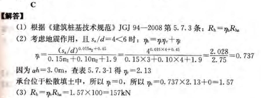 问题 某钻孔灌注桩群桩基础,桩径为0.8m,单桩水平承栽力特征值为(位移控制)沿水平荷载方向布桩棑数垂直水平荷载方向毎排桩数n2= 4,距径比承台位于松散填土中,埋深0.5m,桩的换算深度承台位于松散填土中,埋深0.5m,桩的换算深度考虑地震作用,按《建筑桩基技术规范》JGJ 94-2008计算群桩中复合基桩水平承栽力特征值最接近下列哪个选项? (A) 134kN (B) 154kN (C) 157kN (D) 177kN