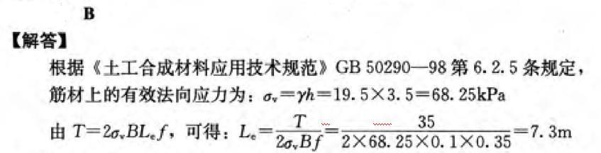 问题 某加筋土挡墙高7m,加筋土的重度γ=19.5kN/m3、内摩擦角φ=30°,筋材与填土的摩擦系数f=0.35,筋材宽度B = 10cm,设计要求筋材的抗拔力为T=35kN,按《土工合成材料应用技术规范》GB50290—98的相关要求,距墙顶面下3. 5m处加筋筋材的有效长度最接近下列哪个选项? (A) 5. 5m (B) 7. 5m (C) 9. 5m (D) 11.5m
