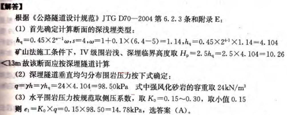 问题 某公路IV级围岩中的单线隧道,拟采用矿山法开挖施工,其标准断面衬砌顶距地面距离为13m,隧道开挖宽度为6.4m,衬砌结构高度为6.5m,围岩重度为24kN/m3, 计算摩擦角为50°。试问根据《公路隧道设计规范》 JTG D70- 2004 计算,该隧道水平围岩压力最小值最接近下列哪项数值(单位:kPa)? (A) 14.6 (B) 41.4 (C) 46.8 (D) 98.5