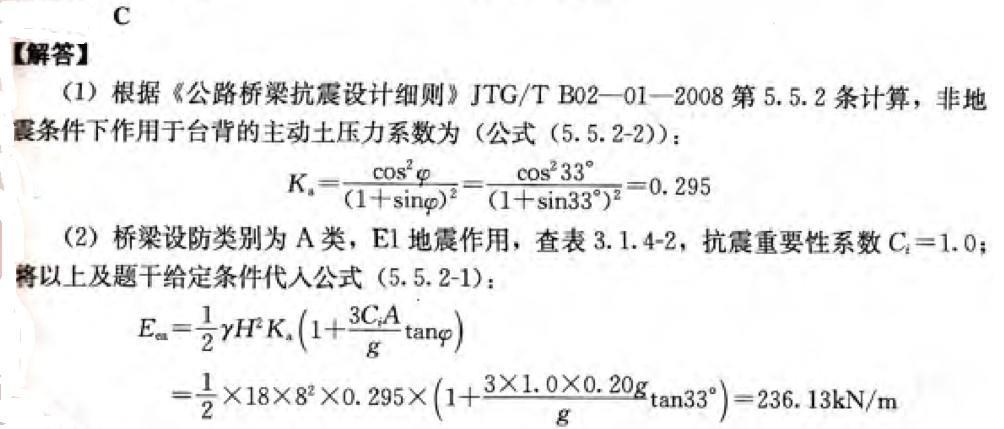 问题 某公路桥梁抗震段防类别为A类,位于抗震设防烈度8度区,水平向设计基本地震加速度峰值为0.20g。设计桥台台身高度为8m,桥台后填土为无黏性土,土的重度为18kN/m3,内摩擦角为33°。问在进行E1地震作用下的抗震设计时,作用于台背每延米长度上的主动土压力为下列何值? (A) 105kN/m (B) 176kN/m (C) 236kN/m (D) 286kN/m