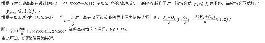 问题 条形基础埋深3.0m,相应于作用的标准组合时,上部结构传至基础顶面的竖向力Fk=200kN/m,为偏心荷载。修正后的地基承载力特征值为200kPa,基础及其上土的平均重度为20kN/m3。按地基承载力计算条形基础宽度时,使基础底面边缘处的最小压力恰好为零,且无零应力区,问基础宽度的最小值接近下列何值?(  )