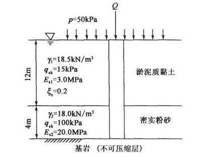 某钻孔灌注桩单桩基础,桩径1.2m,桩长16m,土层条件如图所示,地下水位在桩顶平面处。若桩顶平面处作用大面积堆载p=50kPa,根据《建筑桩基技术规范》...