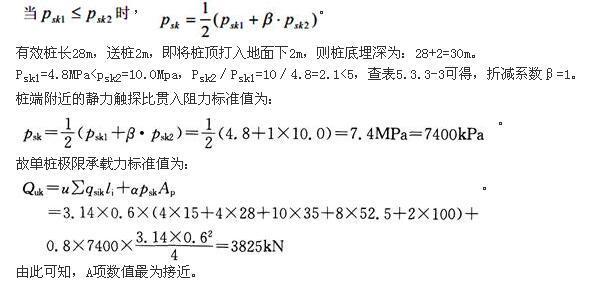 解析 根据《建筑桩基技术规范》(JGJ 94-2008)第5.3.3条规定,当根据单桥探头静力触探资料确定混凝土预制桩单桩竖向极限承载力标准值时,如无当地经验,可按下式计算: