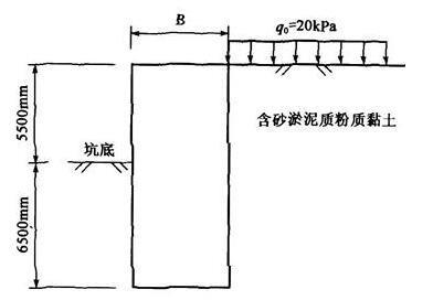 某软土基坑,开挖深度H=5.5m,地面超载q0=20kPa,地层为均质含砂淤泥质粉质黏土,土的重度γ=18kN/m3,黏聚力c=8kPa,内摩擦角φ=15...