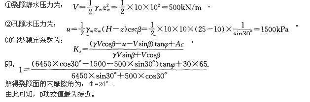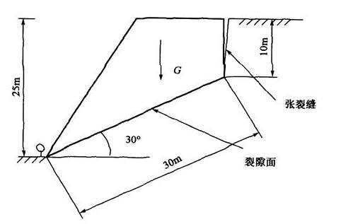 某岩石边坡代表性剖面如下图,边坡倾向270°,一裂隙面刚好从坡脚出露,裂隙面产状为270°∠30°,坡体后缘一垂直张裂缝正好贯通至裂隙面。由于暴雨,使垂直...