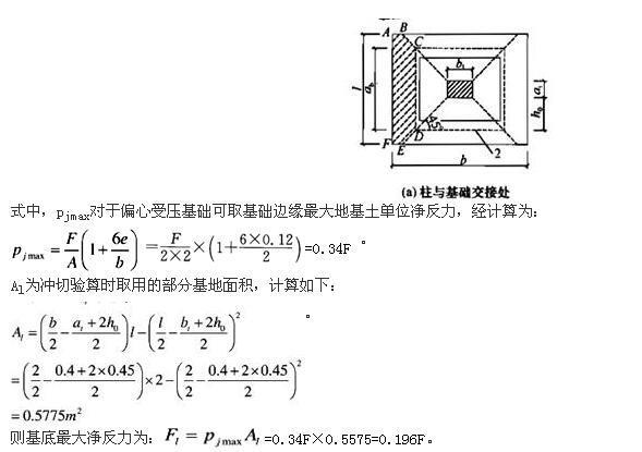 柱下独立方形基础地面尺寸2.0m×2.0m,高0.5m,有效高度0.45m,混凝土强度等级为C20(轴心抗拉强度设计值ft=1.1MPa),柱截面尺寸为0...