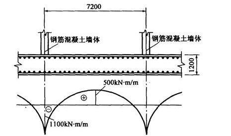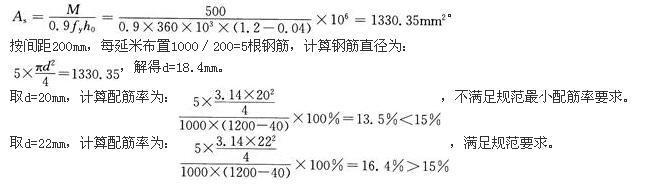问题 某墙下钢筋混凝土筏形基础,厚度1.2m,混凝土强度等级为C30,受力钢筋拟采用HRB400钢筋,主要保护层厚度40mm。已知该筏板的弯矩(相应于作用的基本组合时的弯矩设计值)如图所示。问:按照《建筑地基基础设计规范》(GB 50007—2011),满足该规范规定且经济合理的筏板顶部受力主筋配置为下列哪个选项?(  )(注:C30混凝土抗压强度设计值为14.3N/mm2,HRB400钢筋抗拉强度设计值为360N/mm2)