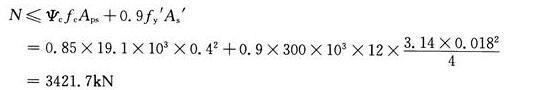 问题 某钢筋混凝土预制方桩,边长400mm,混凝土强度等级C40,主筋为HRB335,12φ18,桩顶以下2m范围内箍筋间距100mm,考虑纵向主筋抗压承载力,根据《建筑桩基技术规范》(JGJ94—2008),桩身轴心受压时正截面受压承载力设计值最接近下列何值?(C40混凝土fc=19.1N/mm2,HRB335钢筋f'y=300N/mm2)(  )