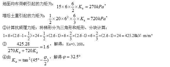 问题 某浆砌块石挡墙高6.0m,墙背直立,顶宽1.0m,底宽2.6m,墙体重度γ=24kN/m3墙后主要采用砾砂回填,填土体平均重度γ=20kN/m3,假定填砂与挡墙的摩擦角δ=0°,地面均布荷载取15kN/m3,根据《建筑边坡工程技术规范》(GB 50330—2013),问墙后填砂层的综合内摩擦角φ至少应达到以下哪个选项时,该挡墙才能满足规范要求的抗倾覆稳定性?(  )