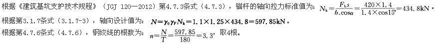 问题 某安全等级为一级的建筑基坑,采用桩锚支护形式。支护桩桩径800mm,间距1400mm。锚杆间距1400mm,倾角15°。采用平面杆系结构弹性支点法进行分析计算,得到支护桩计算宽度内的弹性支点水平反力为420kN。若锚杆施工时采用抗拉设计值为180kN的钢绞线,则每根锚杆至少需要配置几根这样的钢绞线?(  )