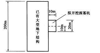 紧靠某长200m大型地下结构中部的位置新开挖一个深9m的基坑,基坑长20m,宽10m。新开挖基坑采用地下连续墙支护,在长边的中部设支撑一层,支撑一端支于已...