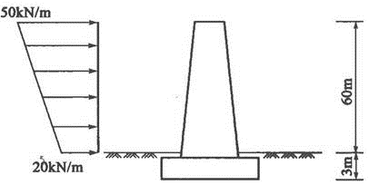 某高度60m的结构物,采用方形基础,基础边长15m,埋深3m。作用在基础底面中心的竖向力为24000kN。结构物上作用的水平荷载呈梯形分布,顶部荷载分布值...