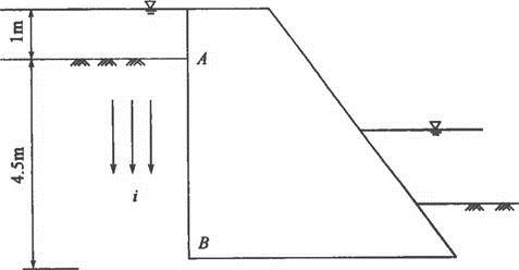 如图所示,某河流梯级挡水坝,上游水深1m,AB高度为4.5m,坝后河床为砂土,其γsat=21kN/m3,c′=0,φ′=30°,砂土中有自上而下的稳定渗...