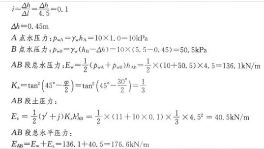 问题 如图所示,某河流梯级挡水坝,上游水深1m,AB高度为4.5m,坝后河床为砂土,其γsat=21kN/m3,c′=0,φ′=30°,砂土中有自上而下的稳定渗流,A到B的水力坡降i为0.1,按朗肯土压力理论,估算作用在该挡土坝背面AB段的总水平压力最接近下列哪个选项?(  )