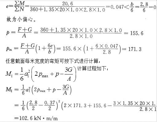 某钢筋混凝土墙下条形基础,宽度b=2.8m,高度h=0.35m,埋深d=1.0m,墙厚370mm。上部结构传来的荷载:标准组合为F1=288.0kN/m,...