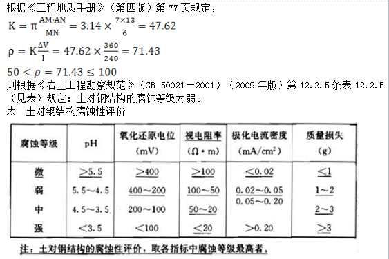 问题 在某场地采用对称四极剖面法进行电阻率测试,四个电极的布置如图所示,两个供电电极A、B之间的距离为20m,两个测量电极M、N之间的距离为6m。在一次测试中,供电回路的电流强度为240mA,测量电极间的电位差为360mV。请根据本次测试的视电阻率值,按《岩土工程勘察规范》(GB 50021—2001)(2009年版),判断场地土对钢结构的腐蚀性等级属于下列哪个选项?(  )