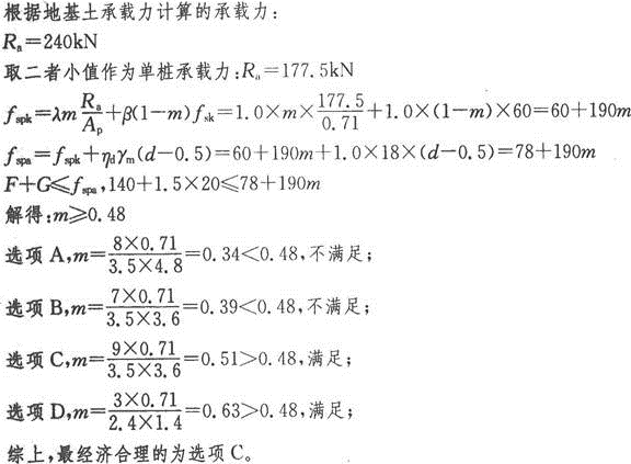 解析 根据《建筑地基处理技术规范》(JGJ 79—2012)第7.1.5条、7.3.3条规定,由桩身强度确定的单桩承载力为: