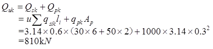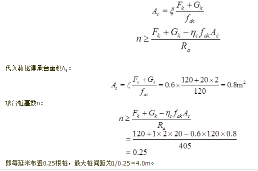 解析 根据《建筑桩基技术规范》(JGJ 94—2008)第5.3.5条规定,单桩竖向承载力标准值Quk为 单桩竖向承载力特征值Ra为: 根据第5.6.1条规定,当软土地基上多层建筑,地基承载力基本满足要求(以底层平面面积计算)时,可设置穿过软土层进入相对较好土层的疏布摩擦型桩。该种减沉符合疏桩基础,可按下列公式确定承台面积和桩数: