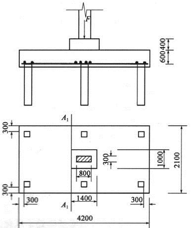 问题 某柱下阶梯式承台如图所示,方桩截面为0.3m×0.3m,承台混凝土强度等级为C40(fc=19.1MPa,ft=1.71MPa)。根据《建筑桩基技术规范》(JGJ 94—2008),计算所得变阶处斜截面A1—A1的抗剪承载力设计值最接近下列哪个选项(图中尺寸单位为mm)(  )