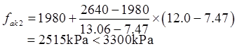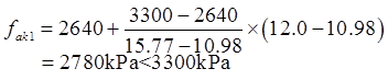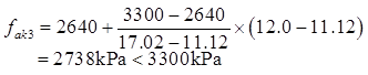 解析 《建筑地基基础设计规范》(GB 50007—2011)附录D.0.7规定,同一土层参加统计的试验点不应少于三点,当试验实测值的极差不超过平均值的30%时,取此平均值作为该土层的地基承载力特征值。 ①试验点S1 极限荷载为6600kPa,由极限荷载确定的承载力特征值为3300kPa;根据D.0.2的规定,深层平板荷载试验的承压板采用直径为0.8m的刚性板,由s/d=0.015确定承载力特征值: s=0.015d=0.015×800=12.0mm 故试验点S1承载力特征值为2780kPa。 ②试验点S2 极限荷载为6600kPa,由极限荷载确定的承载力特征值为3300kPa;由s/d=0.015确定的承载力特征值: s=0.015d=0.015×800=12.0mm 故试验点S2承载力特征值为2515kPa。 ③试验点S3 极限荷载为6600kPa,由极限荷载确定的承载力特征值为3300kPa;由s/d=0.015确定的承载力特征值: s=0.015d=0.015×800=12.0mm 故试验点S3承载力特征值为2738kPa。 三者平均值:(2780+2515+2738)/3=2678kPa 极差:2780-2515=265<2678×0.3=803kPa。 综上,承载力特征值为2678kPa。