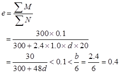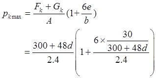 解析 根据《建筑地基基础设计规范》(GB 50007—2011)第5.2.4条规定,当基础宽度大于3m或埋置深度大于0.5m时,从载荷试验或其他原位测试、经验值等方法确定的地基承载力特征值,尚应按下式修正: a=ak+ηbγ(b-3)+ηdγm(d-0.5) 黏性土孔隙比为0.83,液性指数为0.76,查表5.2.4得:ηb=0.3,ηd=1.6。 代入数据计算得: a=130+0+1.6×18×(d-0.5)=115.6+28.8d 偏心距为: 为小偏心。 当基础底面形状为矩形且偏心距e<b/6时,pkmax应按下式计算: ①根据5.2.1条第1款规定,当偏心荷载作用时pk≤a 代入数据得 解得:d≥1.07m。 ②第2款规定,当偏心荷载作用时,除符合式pk≤a要求外,尚应符合下式规定: pkmax≤1.2fa 代入数据得: 解得:d≥1.2m。 综合①②,得d≥1.2m。