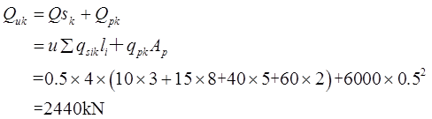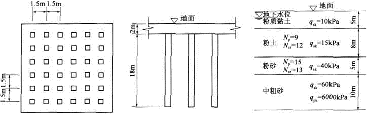 某工程采用低承台打入预制实心方桩,桩的截面尺寸为500mm×500mm,有效桩长18m。桩为正方形布置,距离为1.5m×1.5m,地质条件及各层土的极限侧...