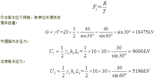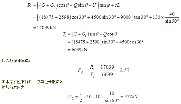 解析 根据《建筑边坡工程技术规范》(GB 50330—2013)附录A.0.2规定,平面滑动面的边坡稳定性系数可按下列公式计算: 将边坡前水压力分解为水平和竖向的力: Q=-U2cos30°=-5196cos30°=-4500kN Gb=U2sin30°=5196sin30°=2598kN 滑体单位宽度重力及其他外力引起的抗滑力为: 将边坡前水压力分解为水平和竖向的力: Q=-577cos30°=-500kN Gb=577sin30°=289kN 滑体单位宽度重力及其他外力引起的抗滑力为: