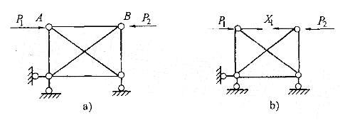 如图a)所示桁架各杆EA均为有限值。当撤去杆AB采用图b)为力法基本体系时,相应力法方程的右端项应: A. >0 B. 1、P2的关系而定