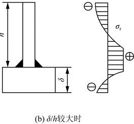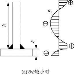 解析 知识点:钢材的力学性能; T形接头的应力分布较对接接头复杂,如题解图所示为T形接头不开坡口角焊缝纵向残余应力分布的情况。由该图可知,当翼板σ厚度与腹板高度h之比较小时,腹板中的纵向残余应力分布相似于板边堆焊,如图(a)所示,比值较大时与等宽板对接焊情况相似,如图(b)所示,腹板和翼缘相交处的纵向焊接残余应力为拉应力。