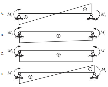 图中所示工形截面简支梁的跨度、截面尺寸和约束条件均相同,根据弯矩图(|M1|>|M2|)可判断整体稳定性最好的是(  )。