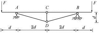 解析 采用截面法进行计算。对整体进行分析,由结构对称性可知,AB支座反力相等,均为F,方向向上。将结构沿BC杆上一点与AD杆上一点的连线方向截开,对右半部分进行分析,由A点力矩平衡可知, 解得,CD杆的内力
