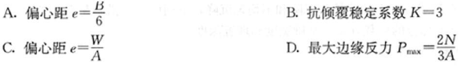 问题 已知矩形基础底面的压力分布为三角形,最大边缘压力为Pmax,最小边缘压力为零,基础的宽度为B,长度为L,基础底面积为A,抵抗矩为W,传至基础底面的竖向力为N。下列的表述中符合上述基础底面压力分布特征的正确说法是()。