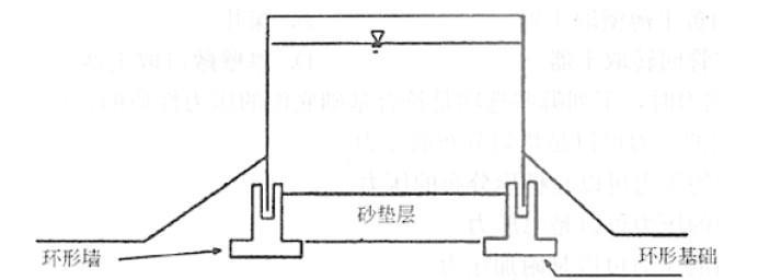 问题 钢油罐剖面如图所示,油罐的直径40m,环形基础,宽度2m,环形墙的高度2.0m,设计时下列哪些选项的判断是正确的?( ) A.环形基础的主要作用是承受由钢底板传来的储油重量,通过环形基础把全部的油灌荷载传给地基 B.油灌中油的重量主要通过底板传给砂垫层再由砂垫层传给地基 C.环形墙承受由砂垫层传来的水平荷载 D.环形基础的主要作用是承受钢油灌的自重和约束砂垫层