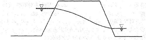 问题 下图所示的均质土坝的坝体浸润线,它应该是哪种排水型式() A.棱体排水 B.褥垫排水 C.无排水 D.贴坡排水