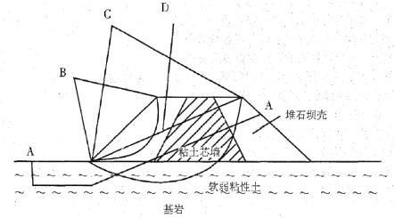 对于下图所示的有软弱枯性土地基的粘土厚心墙堆石坝在坝体竣工时,下面哪些滑动面更危险() A.穿过坝基土的复合滑动面 B.通过堆石坝壳的圆弧滑动面 ...