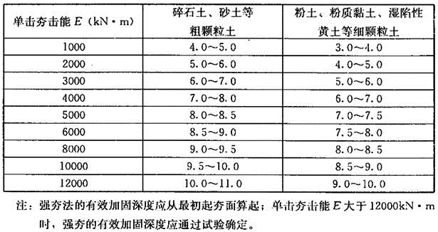 解析 A项,根据《建筑地基处理技术规范》(JGJ 79—2012)第7.3.1条规定,搅拌桩不适合含大孤石或障碍物较多且不易清除的杂填土;B项,第6.3.3条表规定,单击夯击能1000kN·m的有效加固深度约为4.0m;C项,第7.8.1条规定,柱锤扩桩法适用于处理杂填土、粉土、黏性土、素填土和黄土等地基,有效加固深度达10m;D项,第7.7.1条规定,CFG桩不适合杂填土地基。 题17表 强夯的有效加固深度(m)