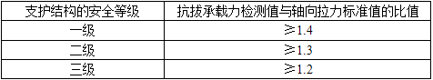 解析 A项正确,《建筑基坑支护技术规程》(JGJ 120—2012)附录A.2.3条规定,锚杆极限抗拔承载力实验宜采用多循环加载法,A.2.5条第2款规定,每级加、卸载稳定后,在观测时间内测读锚头位移不应少于3次; B项错误,A.4.6条第2款规定,在抗拔承载力检测值下测得的弹性位移量应大于杆体自由段长度理论弹性伸长量的80%; C项错误,A.4.1条规定,锚杆抗拔承载力检测试验,最大试验荷载应不小于第4.8.8条规定的抗拔承载能力检测值(见题解表-1),可知抗拔承载能力检测值应按支护结构的安全等级取系数,只有在二级与轴向拉力标准值才是1.3倍关系; 题解表-1 锚杆的抗拔承载力检测值 D项正确,A.2.6条第2款规定,锚头位移不收敛时,应终止继续加载,近似认为杆体已被破坏。