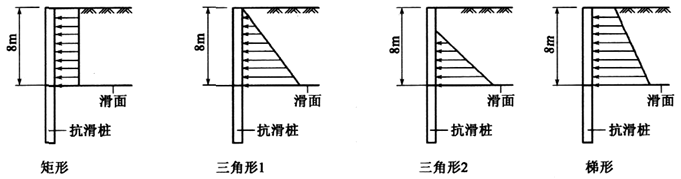 问题 某铁路路堑边坡修建于大型块石土堆积体,采用如图所示的抗滑桩支护。桩的悬臂段长8m,试问作用在桩上的滑坡推力的分布形式宜选用下列哪个图形(  )