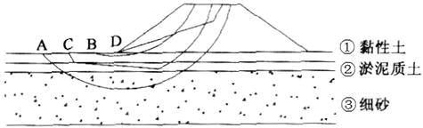 一个粉质黏土的压实填方路堤建于硬塑状黏性土①地基上,其下为淤泥质土薄夹层②,再下层为深厚中密细砂层③,如图所示,判断下面哪个选项的滑裂面是最可能滑裂面( ...
