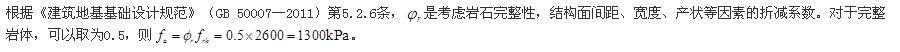问题 某完整岩体的岩石饱和单轴抗压强度标准值frk=2600kPa,其地基承载力特征值为(  )KPa。