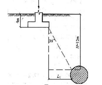 问题 某场地中存在单个岩溶洞穴,如图3所示,洞穴顶面埋深H为12m,岩体的主力扩散角为38°。对于基础埋深d为4m的多层厂房,基础边缘应至少离开洞穴边界(  )m才能保证洞穴不会危及基础的稳定性。