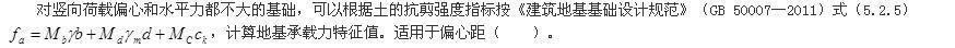 解析 对竖向荷载偏心和水平力都不大的基础来说,当荷载偏心距e≤b/30(b为偏心方向基础边长)时,可以采用《建筑地基基础设计规范》(GB 50007—2011)推荐的以界限荷载p/4为基础的理论公式计算地基承载力特征值。