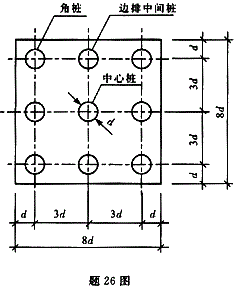 一埋置于黏性土中的摩擦型桩基础,承台下有9根直径为d,长度为l的钻孔灌注桩,承台平面尺寸及桩分布如图所示,承台刚度很大,可视为绝对刚性,在竖向中心荷载作用...