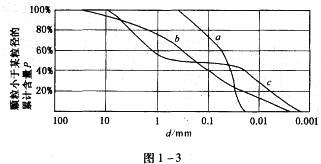 图1-3为砂土的颗粒级配曲线,试判断属于下列( )类。 A. a线级配良好,b线级配不良,c线级配不连续 B. a线级配不连续,b线级配良好,c线...