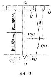 如图4-3所示桩,其中0.5l0长穿过软弱土层,0.5l0长在粉土层中,之后桩端进入卵砾石层,桩顶受竖向荷重Q后,因大面积地面填土,使桩身轴力变化,通过桩...
