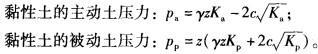 解析 主动土压力、黏性土的主动土压力、黏性土的被动土压力的相关计算公式分别为: 静止土压力:p0= yzKa ; 主动土压力pa、静止土压力p0和被动土压力pp三种土压力之间的关系为:pa<p0<pp。 墙体的位移方向和位移量决定着土压力性质和土压力的大小。A项,混淆了三个动力的定义概念,静止土压力适用于墙绝对不动的情况,主动土压力适用于墙向前有微小的移动或转动的情况,被动土压力适用于墙受外力产生向后的微小位移或转动时。B 项,黏土的主动土压力取决于两部分:①土的重度(内摩擦角φ=0°。时等于上覆土自重压力和坡顶超载之和);②黏结力。D项,还须考虑地下水对砂土抗剪强度的影响,因为地下水位的上升将会导致黏性填土与内摩擦角明显降低。