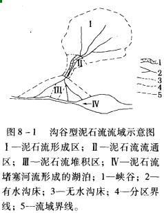 解析 泥石流流域按沟谷的形态可分为:①沟谷型泥石流,是发育比较完善的泥石流沟,流域轮廓清晰,多呈瓢形、长条形或树枝形,流域面积以5 ~ 50平方公里者居多,能明显地区分出泥石流的形成区、流通区和堆积区,如图8-1所示。 ②山坡型泥石流,是指发育在斜坡面上的小型泥石流沟谷。它们的流域面积一般不超过2平方公里,流域轮廓呈哑铃形,沟坡与山坡基本一致,沟浅、坡短,流通区很短,甚至没有明显的流通区,形成区和堆积区往往直接相贯通。沉积物棱角明显,粗大颗粒多搬运至杂锥体下部。