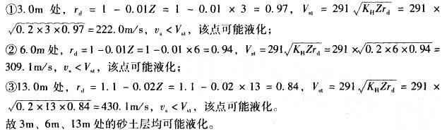 问题 某土石坝坝址区地震烈度为8度,在10号孔深度为3m、6m和13m处测得剪切波速值分别为104m/s、217m/s和313m/s,该孔15m深度范围内土层2. 0m以内为回填黏性土层,2m至15m内为第四纪沉积粉砂细砂层,在工程正常运用时,该处地面淹没于水面以下,在进行地震液化初判时,下列( )选项是正确的。 A. 3m处的砂土层可能液化,6m和13m处的砂土层不液化 B. 3m和6m处的砂土层可能液化,13m处的砂土层不液化 C. 3m、6m、13m处的砂土层都可能液化 D. 3m、6m、13m处的砂土层均不液化