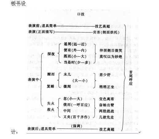 问题 阅读材料,完成第16-18题。 《口技》林嗣环原文 京中有善口技者。会宾客大宴,于厅事之东北角,施八尺屏障,口技人坐屏障中,一桌、一椅、一扇、一抚尺而已。众宾团坐。少顷,但闻屏障中抚尺一下,满堂寂然,无敢哗者。 遥闻深巷中犬吠,便有妇人惊觉欠伸,其夫呓语。既而儿醒,大啼。夫亦醒。妇抚儿乳,儿含乳啼。妇拍而呜之。又一大儿醒,絮絮不止。当是时,妇手拍儿声,口中呜声,儿舍乳啼声,大儿初醒声,夫叱大儿声,一时齐发,众妙毕备。满坐宾客无不伸颈,侧目,微笑,默叹,以为妙绝。 未几,夫齁声起,妇拍儿亦渐拍渐止。微闻有鼠作作索索,盆器倾侧,妇梦中咳嗽。宾客意少舒,稍稍正坐。 忽一人大呼“火起”。夫起大呼,妇亦起大呼。两儿齐哭。俄而百千人大呼,百千儿哭,百千犬吠。中间力拉崩倒之声,火爆声,呼呼风声,百千齐作;又夹百千求救声,曳屋许许声,抢夺声,泼水声。凡所应有,无所不有。虽人有百手,手有百指,不能指其一端;人有百口,口有百舌,不能名其一处也。于是宾客无不变色离席,奋袖出臂,两股战战,几欲先走。 忽然抚尺一下.群响毕绝。撤屏视之,一人、一桌、一椅、一扇、一抚尺而已。 课文导语 本文记叙了一场精彩的口技表演,读来如临其境,如闻其声,令人叹服。作者笔下的这场口技表演距今已三百多年,今天仍能使我们深切感受到这一传统民间艺术的魅力。 单元导语 “语文是人类文化的重要组成部分。”这个单元选的是文化艺术方面的文章。通过阅读,我们可以从中看到作者对艺术的体验和感悟,及由此生发的对人生的思考和认识,可以提高自己的文化素养。陶冶情操。学习本单元,要在理解课文的基础上,练习自己的生活体验,体会课文的思想内容.品味并积累优美的语句。 《义务教育语文课程标准(201 1年版)》的相关规定 诵读古代诗词,阅读浅易文言文,能借助注释和工具书理解基本内容,注重积累、感悟和运用,提高自己的欣赏品味。 课后练习 一、熟读课文,根据提示,画出并体会文中描摹音响的语句。 1.表现深夜一家四口由睡到醒、由醒入睡的过程。 ①由远而近,由外而内,由小而大,由分而合。 ②由大而小,由密而疏,微闻余声。 2.表现从失火到救火的情形。 ①响声大作,由少而多。 ②百千齐作,应有尽有。 二、联系课文内容,回答下列问题。 1.文中多次描述听众的反应,这些描述有什么效果? 2.文中前后两次把极简单的道具交代得清清楚楚,这对文章的结构和表现口技表演者的技艺有什么作用? 三、解释下列句子中加点的词。 1.会宾客大宴…… 2.但闻屏障中抚尺一下,满座寂然,无敢哗者。 3.妇抚儿乳,儿含乳啼,妇拍而呜之。 4.宾客意少舒。稍稍正坐。 5.虽人有百口,口有百舌,不能名其一处也。 6.于是宾客无不变色离席,奋臂出袖,两股战战,几欲先走。 四、辨析下列表示时间的词语,将它们分别填在横线上。然后以这些词语为线索,背诵全文。 少顷既而是时一时未几忽俄而忽然 1.表示突然发生: 2.表示同时发生: 3.表示相继发生: 4.表示在特定的时间内发生: 5.表示过了很短时间就发生: 学生情况 七年级。班级人数45人 课时安排 二课时 教学条件 教室配有多媒体设备,能够演示幻灯片,播放视频、音频文件等。 问题: 请为本课设计一则板书。