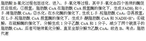 脂酰CoAβ-氧化过程的顺序是A.脱氢,加水,再脱氢,加水 B.脱氢,脱水,再脱氢,硫解 C.脱氢,加水,再脱氢,硫解 D.水合,脱氢,再加水,硫解...